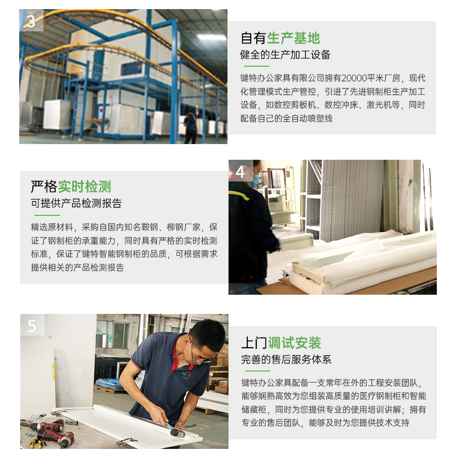 品牌优势:金键特柜业致力于医用钢柜,办公钢柜的研发生产近二十年,拥有严格的产品制度与高质量 生产线的大型生产基地,完善的服务体系,广受海内外客户认可和保持长期稳定的合作,全力保障每一 位客户的需求